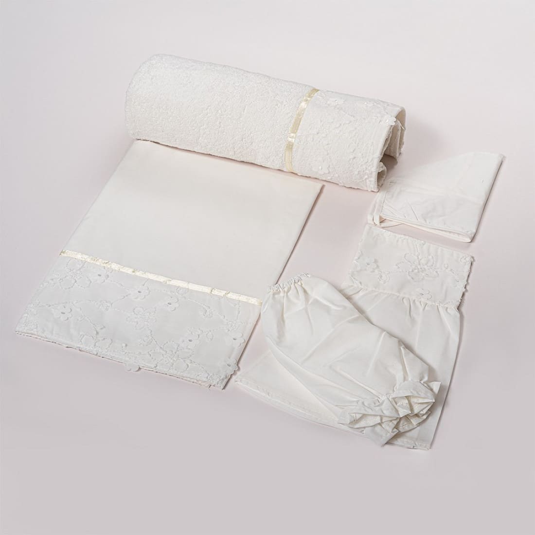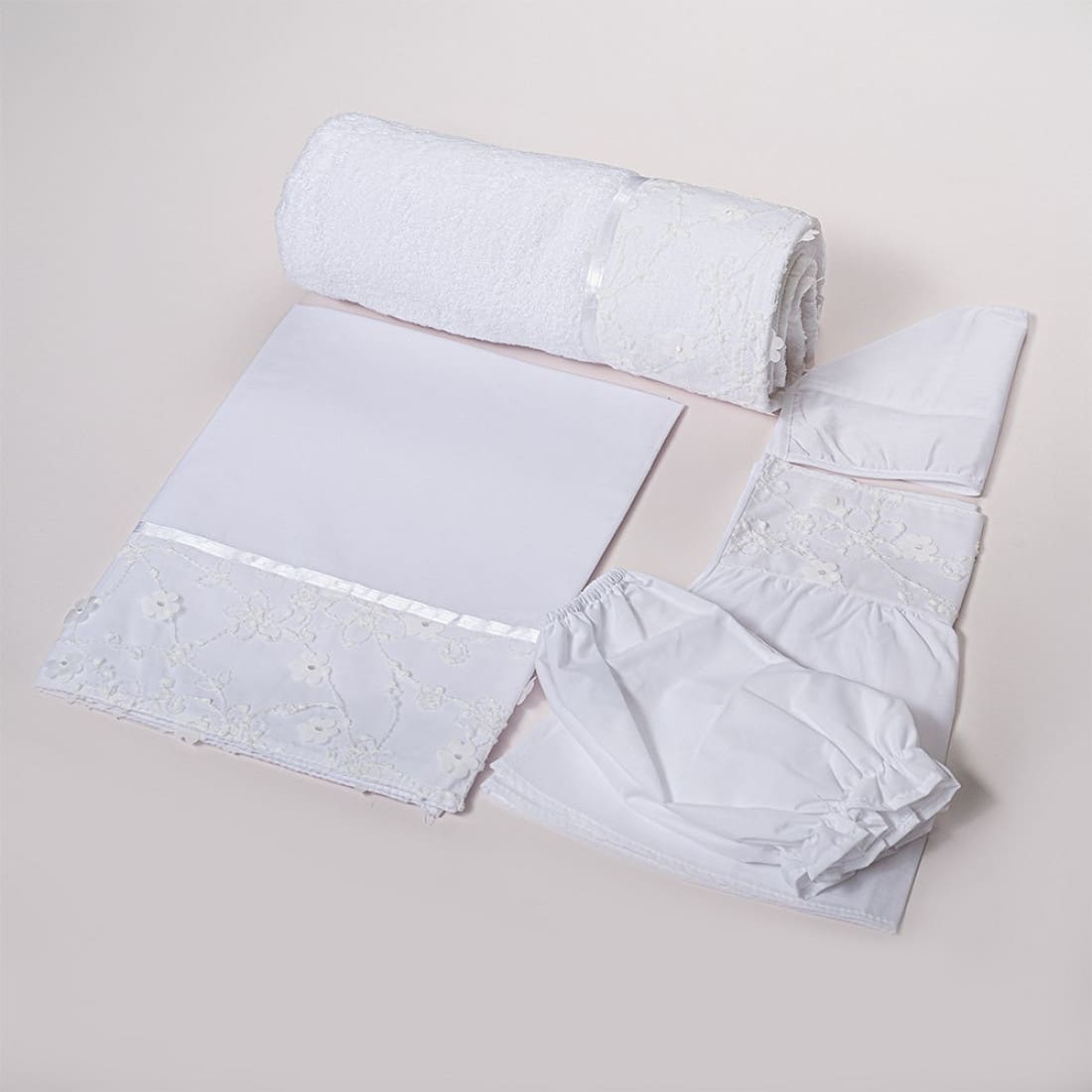 Σετ βαμβακερά λαδόπανα για κορίτσι. Διακοσμημένα με ανάγλυφη δαντέλα με λουλούδια. Χαρίζοντας κομψότητα και ξεχωριστή εμφάνιση στη βάπτιση. Το σετ περιλαμβάνει μια μεγάλη πετσέτα μπάνιου, ένα λευκό λαδόπανο και τα εσώρουχα.